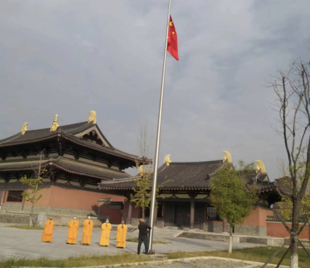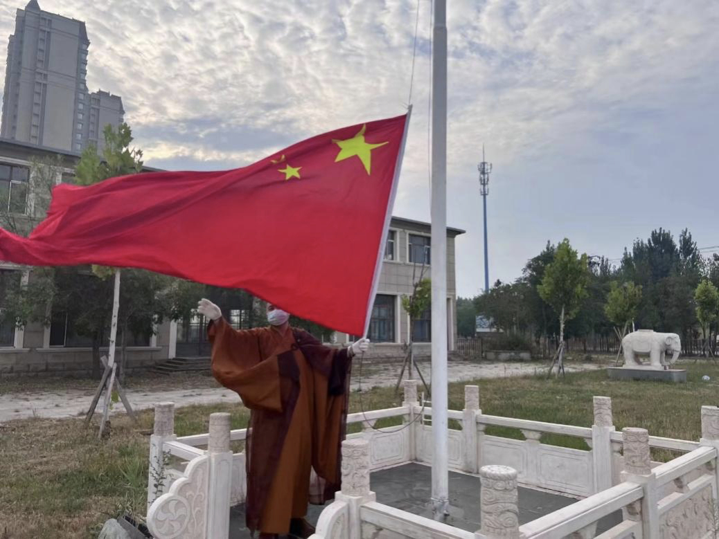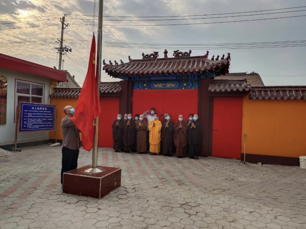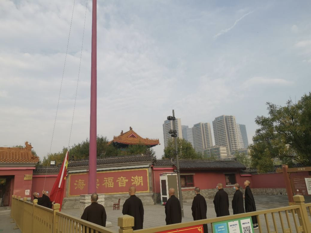 举国上下,普天同庆!今年是中华人民共和国成立七十三周年,也是党的二十大召开之年,在这美好的时刻,10月1日天津市佛教界各场所纷纷举行迎国庆升国旗活动,各场所教职人员,整齐有序举行升国旗仪式,以此献礼伟大的祖国73华诞。天津佛教协会会长达云法师率大悲院教职人员参加了升旗仪式。