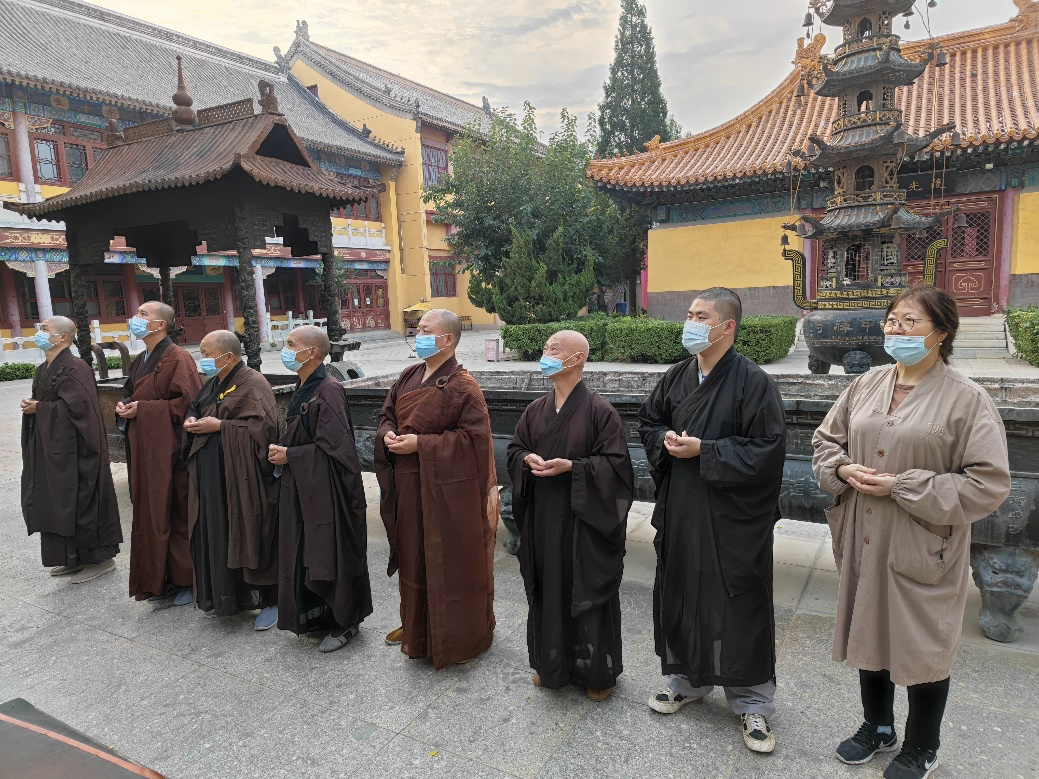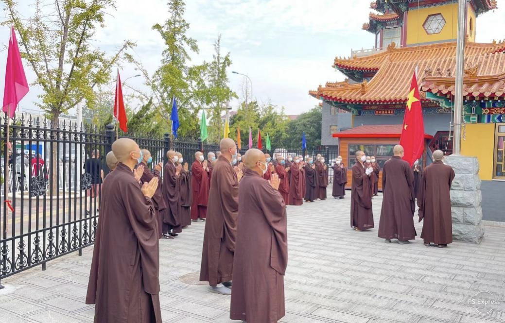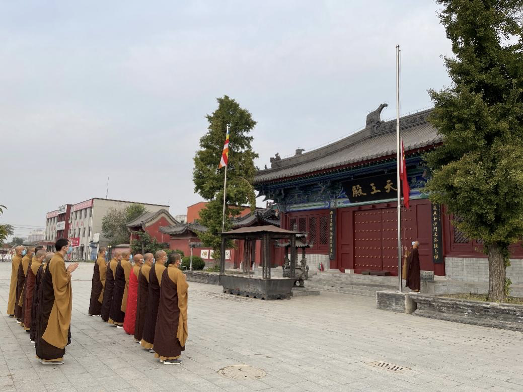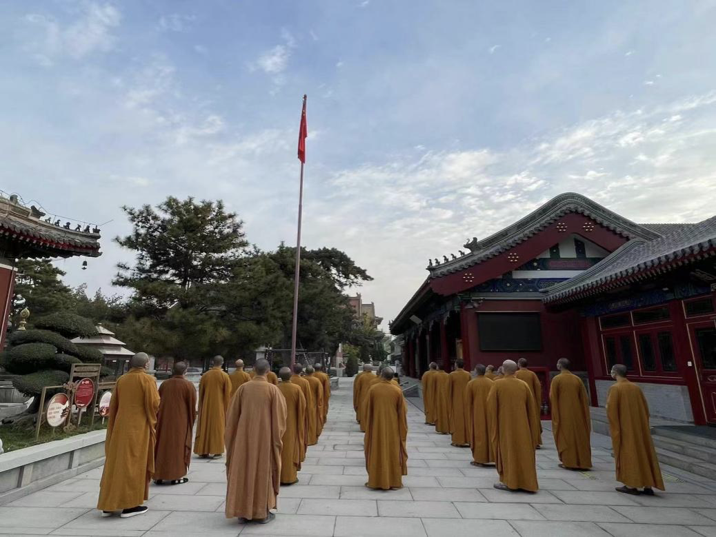 举国上下,普天同庆!今年是中华人民共和国成立七十三周年,也是党的二十大召开之年,在这美好的时刻,10月1日天津市佛教界各场所纷纷举行迎国庆升国旗活动,各场所教职人员,整齐有序举行升国旗仪式,以此献礼伟大的祖国73华诞。天津佛教协会会长达云法师率大悲院教职人员参加了升旗仪式。