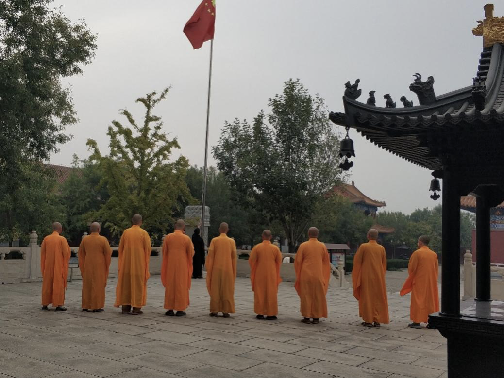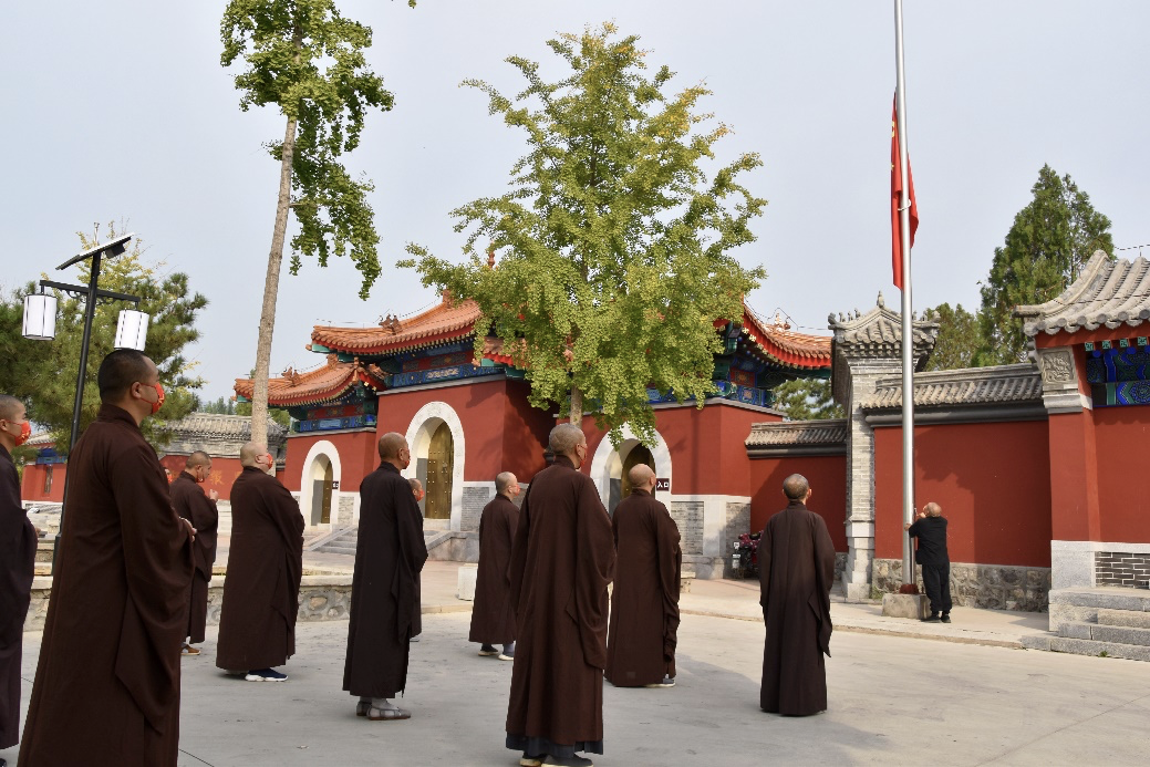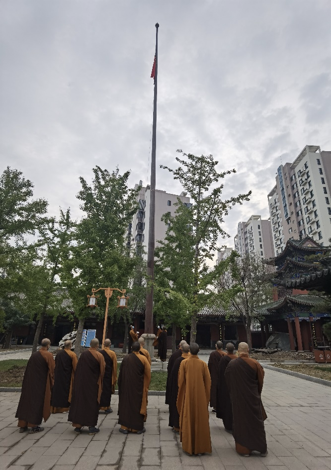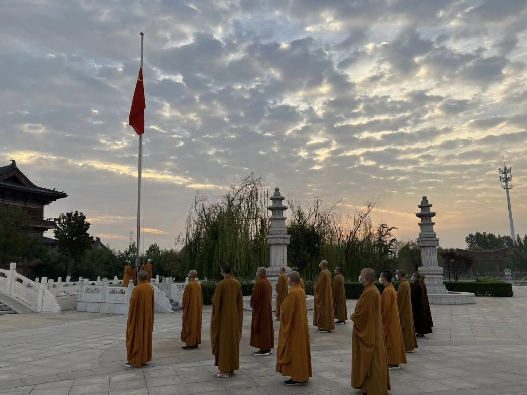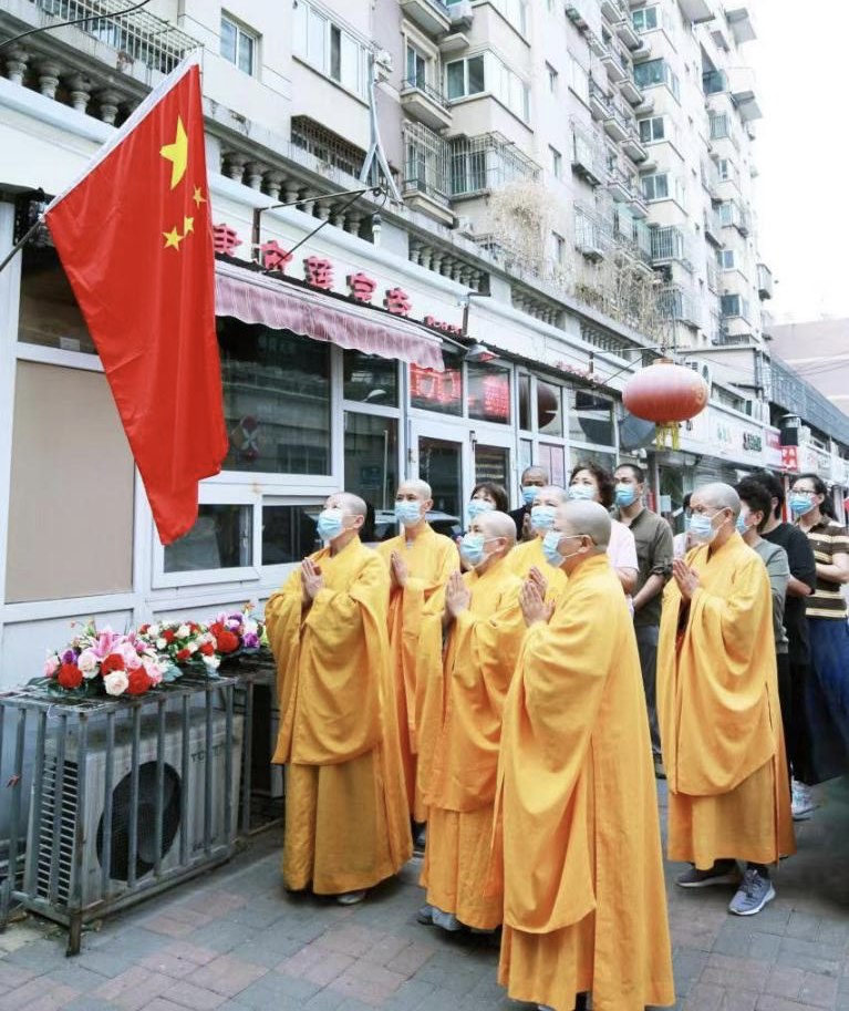 在雄壮的国歌声中,鲜艳的五星红旗冉冉升起,所有人员庄严肃穆地向国旗行注目礼,向祖国致以最崇高的敬意,表达天津市佛教界对祖国的感恩之情和美好祝福!祈愿祖国繁荣富强、社会和谐安定、人民幸福安康!